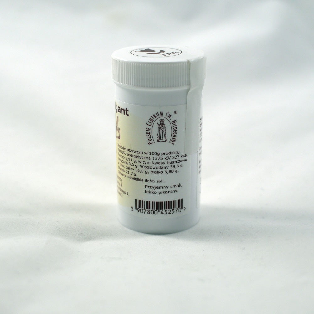 Ingredients: milk sugar, fennel fruit powder (seeds) 20%, galangal root powder 20%, releasing agents: cellulose, talc, silica.
