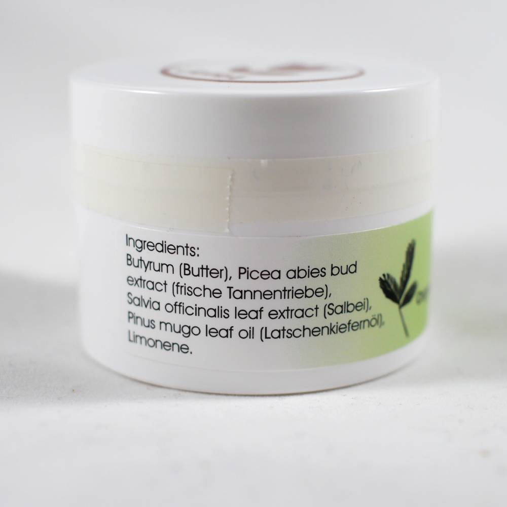 Ingredients: butter, Norway spruce, fir, common sage, mountain pine leaf oil.