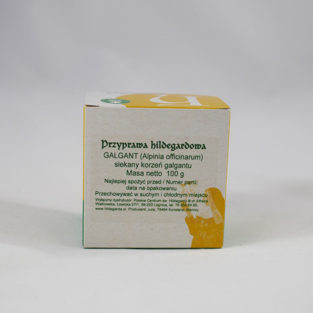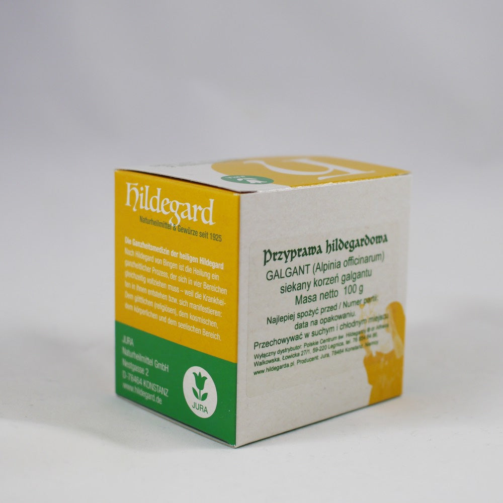 Chopped galangal root (Latin: Alpinia officinarum ) is an important and valuable spice that, according to St. Hildegard of Bingen, should be consumed every day. It is intense and quite spicy in taste. It is therefore most often added in pinches to meals (breakfast, lunch, dinner, as well as desserts, bread, cakes and cookies).