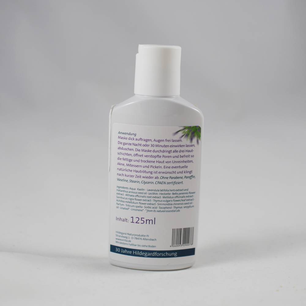 Application: Shake before use! Apply a thick mask to your face, leaving the eye area without the mask. Leave for 30 minutes. Rinse with plenty of lukewarm water and cleanse with lily flower water. You can also rub the mask onto pimples, blackheads and discolorations with the mask every day before going to bed. Let the mask work all night long and rinse it off in the shower in the morning.