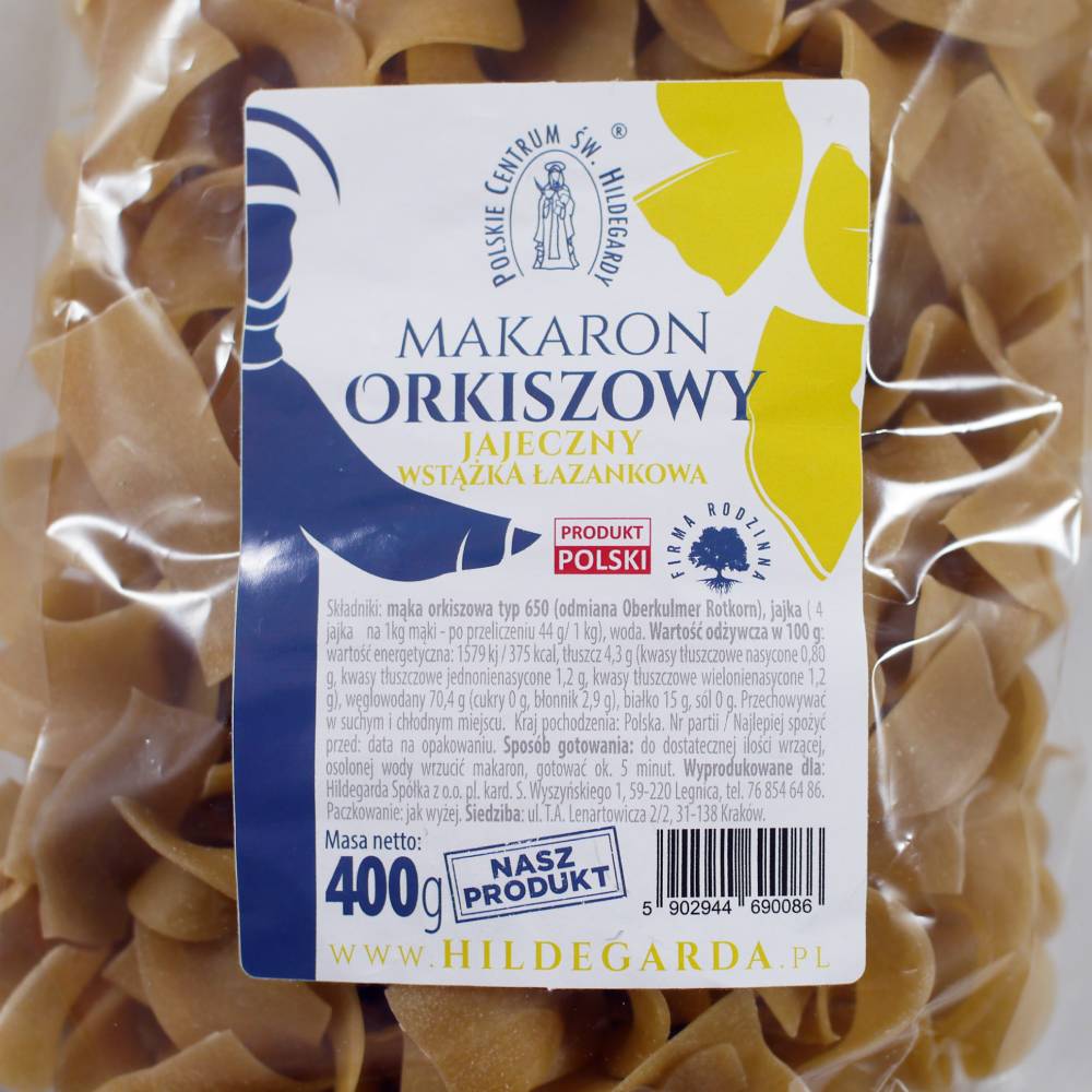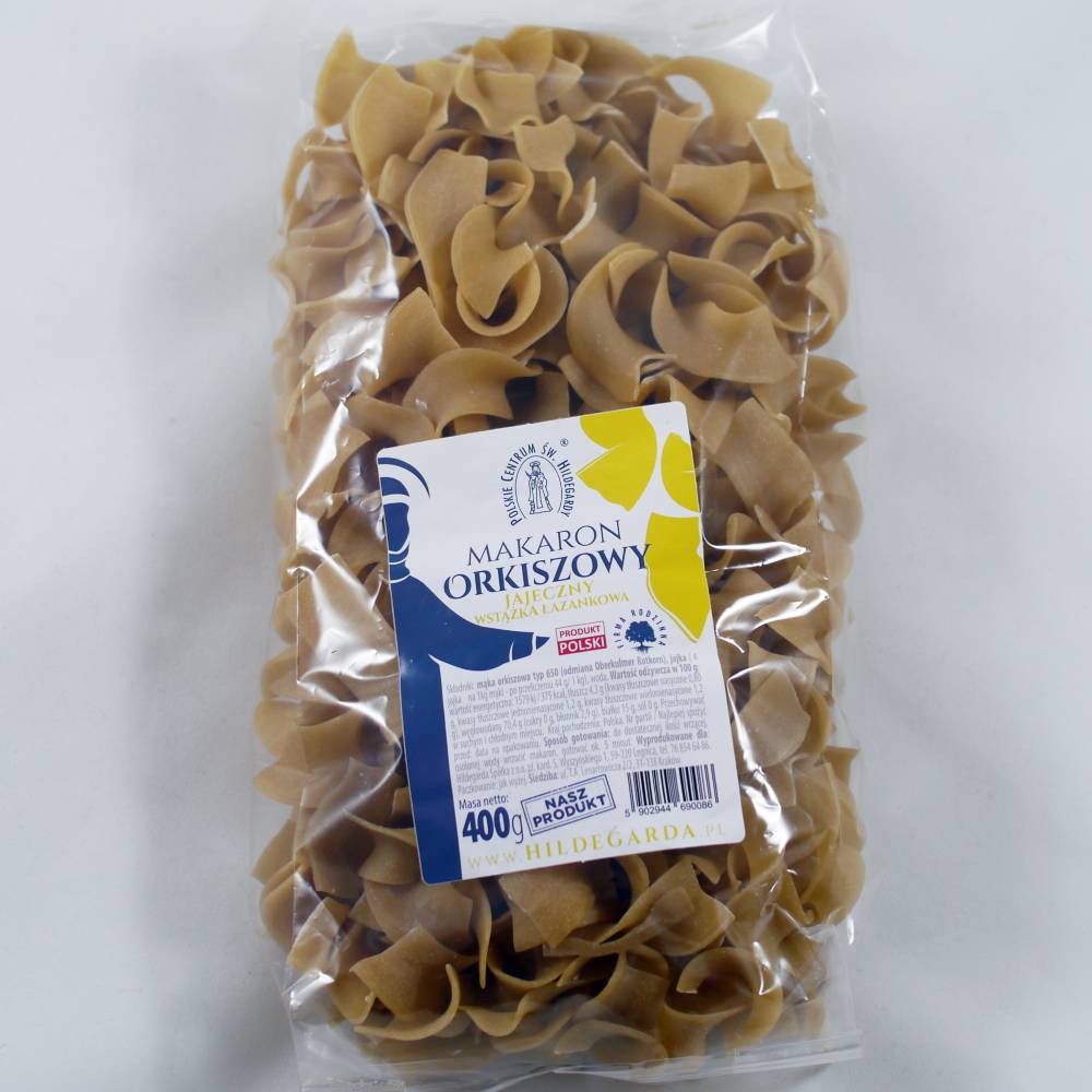 Pasta made from spelt flour. Perfect for preparing basic dishes and as an addition to broth, soups, and all kinds of casseroles. Spelt pasta is an excellent, Hildegard culinary proposal for preparing basic dishes (e.g. various casseroles), salads, salads, supplementing soups, as well as combining with aromatic fruits (apples, cherries, raspberries) and spices.